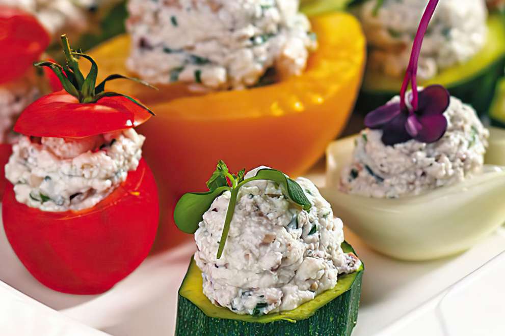 Habzsákba töltjük a fűszeres túrókrémet, és a zöldségfalatokra túrót nyomunk.